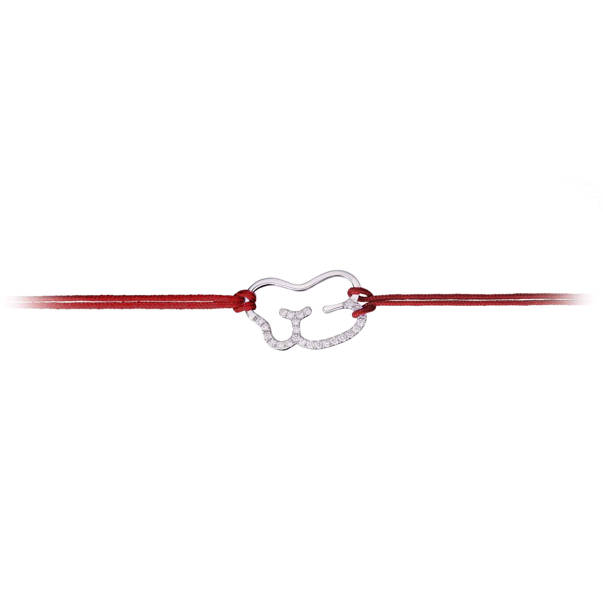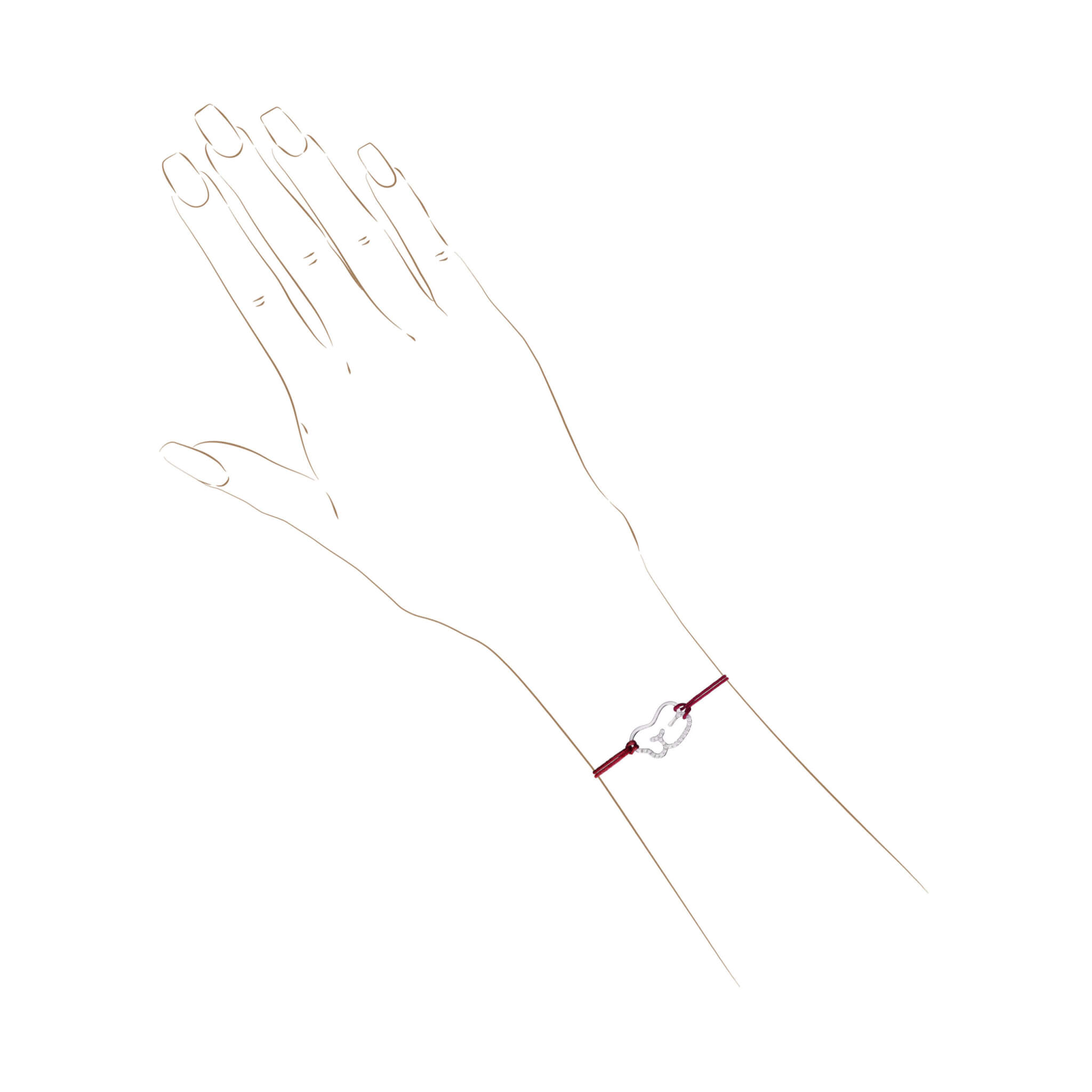 Bracelet en or 18 carats (Poids d’or : 0,75g) serti diamants blancs (0,15cts) monté sur un cordon en soie rouge foncé. Disponible en or rose, or jaune, or blanc et or noir.